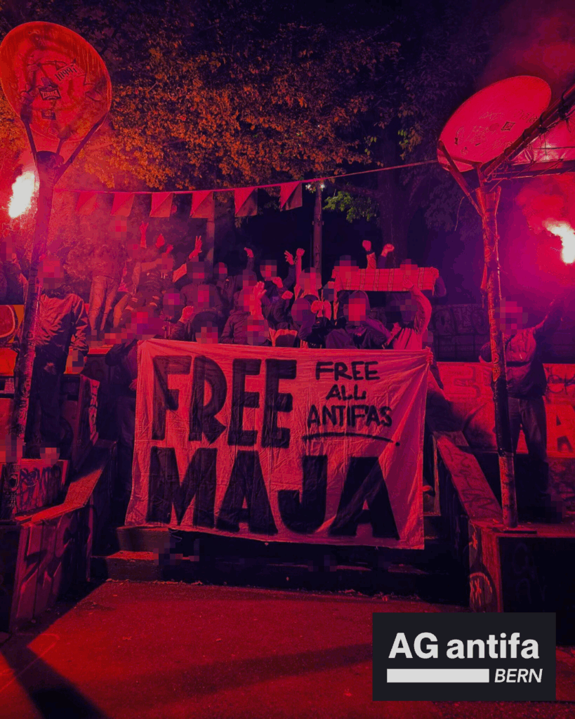 Als kleiner Teil der grossen Solidaritätsbewegung für die Angeklagten Antifas, entstand gestern in Bern dieses Solifoto. Solche kollektiven Momente, mögen sie manchmal auch klein sein, ermöglichen es, dass wir uns gegenseitig stärken und gemeinsam in Bewegung kommen. Unterwerfen wir uns nicht der Logik von Gerichten und irgendwelchen Urteilen, sondern überlegen uns Wege, wie wir die Kämpfe weiterführen können. Die nächste Gelegenheit ist am kommenden Antifatresen am 18. September, wo wir über Hannas Urteilsverkündung austauschen und Postkarten für Maja schreiben werden.